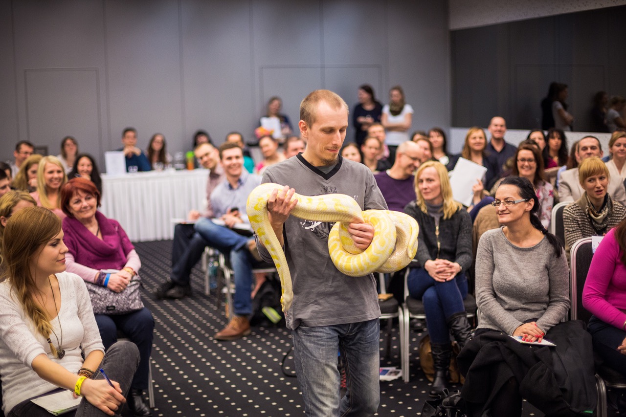 Po vysvetlení teórie zakúsili niekoľkí účastníci odbúranie strachu priamo na pódiu a aby sme sa presvedčili, že to naozaj zafungovalo, zavítali k nám nachvíľu zvierací pomocníci – chutná tarantula Julča a obrovský škrtič Aladár. Pani s dlhoročnou fóbiou z pavúkov a hadov ešte hodnú chvíľu nemohla uveriť, že sa ich dokázala dotknúť.